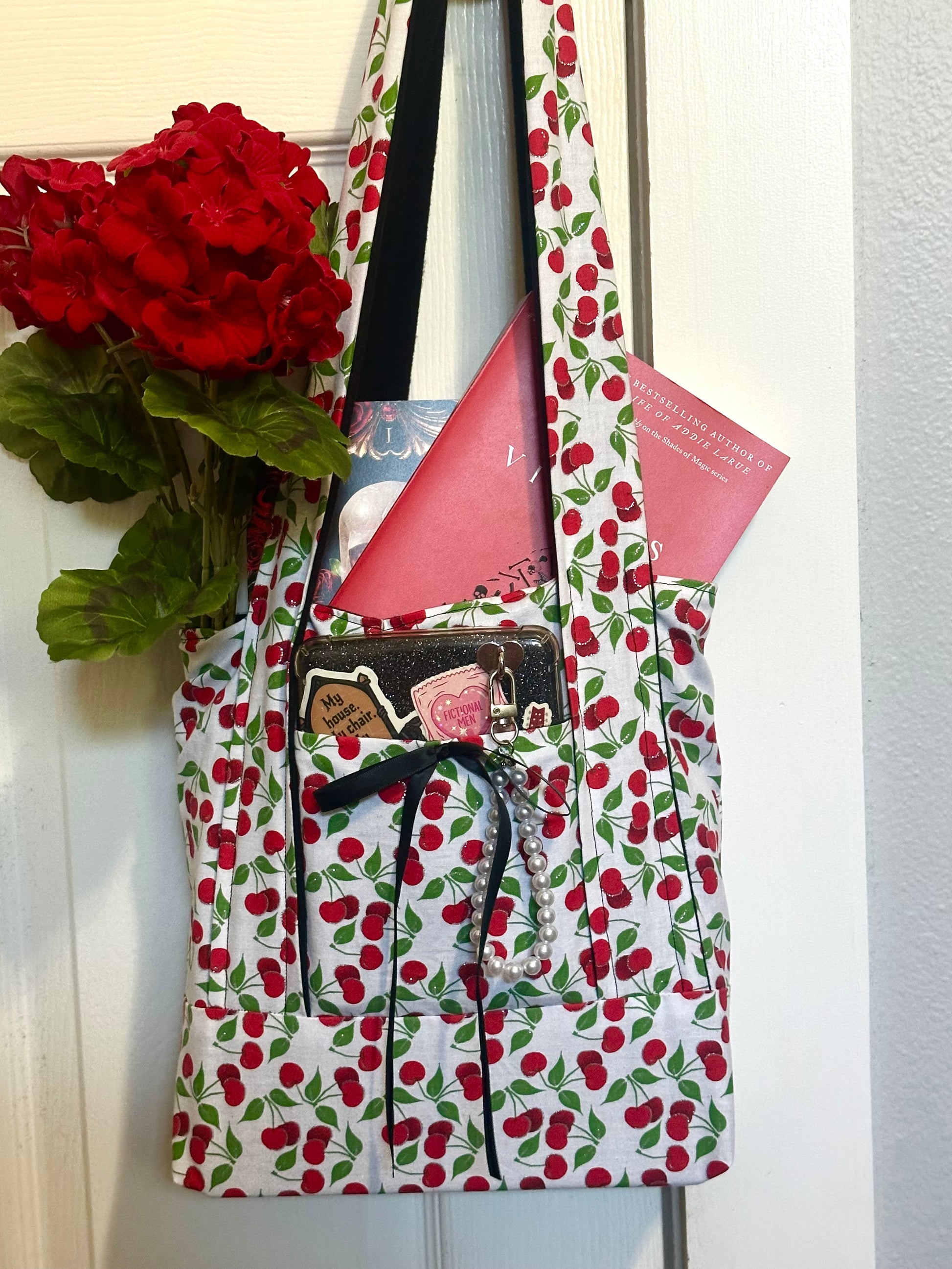 Hand sewn tote bag with a cherry deisgn. Has an outer pocket with a bow. Perfect for holding your book or for just a day out.