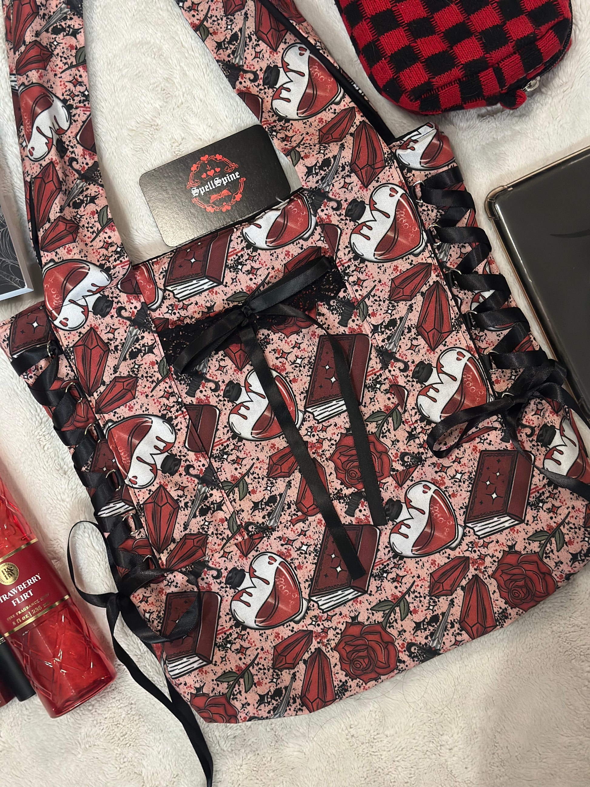 Hand sewn tote bag with books and bows design. Has an outer pocket with a bow. Added corset design on the side of the bag. Perfect for holding your books or for just a day out.